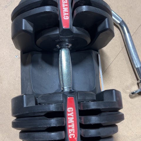 Justerbara hantlar med ställ för styrketräning i hemmet eller på gym. Vikterna kan ställas in i flera steg från cirka 2,5 till 25 kg per hantel, vilket gör det möjligt att anpassa belastningen efter övning och nivå. Hantlarna har ett kompakt format där flera viktplattor samlas i en enhet, och ett ställ som håller hantlarna på plats mellan passen.