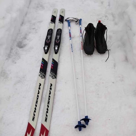 Längdskidor med pjäxor och stavar