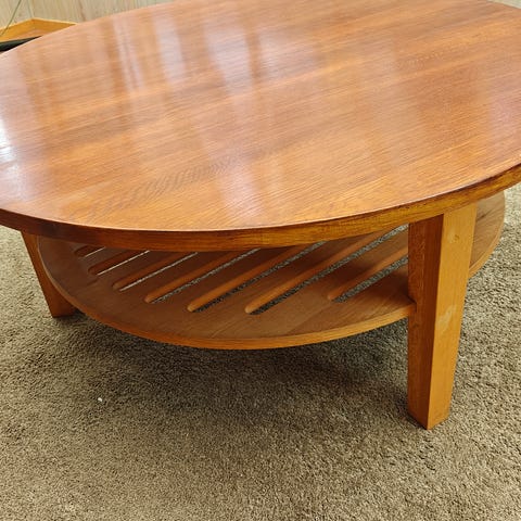 Runt träbord med dekorativ fanér på bordsskivan och intarsialiknande mönster i mitten. Bordet har svarvade ben med mörka kontrastdetaljer och en bågformad stagkonstruktion mellan benen för extra stabilitet.