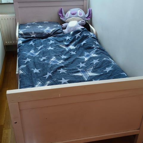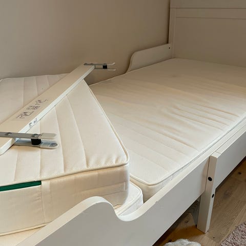 IKEA Sundvik utdragbar sängstomme med ribbotten och Nattsmyg skummadrass