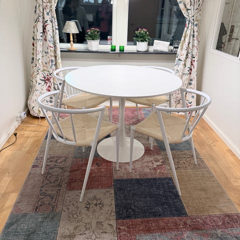 Runt köksbord med glasskiva och 4 stolar. Väl använt men väldigt fint