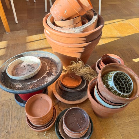 Cylinderformade krukor i terrakotta i brun färg. Två storlekar som lämpar sig för inomhus- eller utomhusbruk. Krukorna har dräneringshål i botten och passar för plantering av olika typer av växter, exempelvis mindre träd, buskar eller större krukväxter. Ytan har ett rustikt utseende med viss patina från användning. Frostsäkra. Mått 26x26 cm för den lilla och 36x36 cm för den stora.