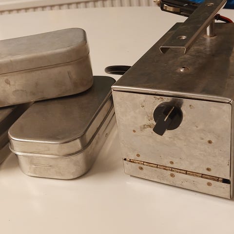 Används för att hålla maten varm under dagen. Knappast använd, suttit i förråd.