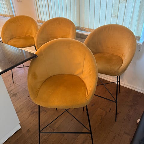 2 st tygbeklädda barstolar med sits i grått och ben i silver.