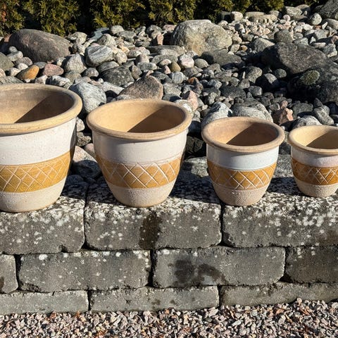 Säljer tre vackra italienska terrakottakrukor med tillhörande fat. Rejäla och dekorativa krukor i klassisk terrakotta som passar lika fint på altanen, i trädgården eller i ett uterum.