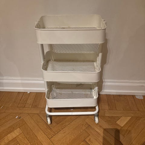 IKEA Nissafors rullvagn i grön metall. Vagnen har tre hyllplan, där det översta är perforerat för ventilation och avrinning. Undre hyllplanet har högre kanter för att hålla saker på plats. Utrustad med fyra hjul för enkel förflyttning. Passar till förvaring i till exempel barnrum, kök, badrum eller arbetsplats.
