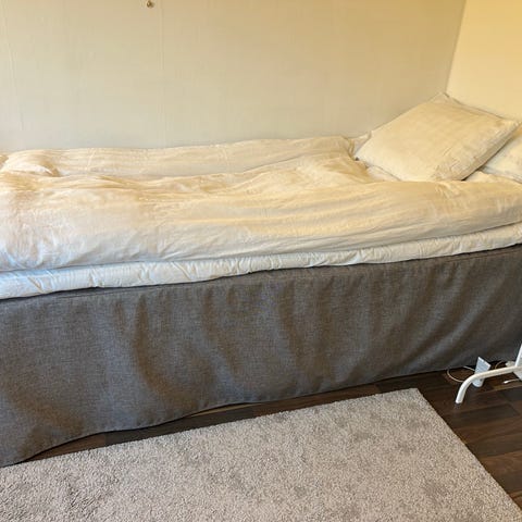 IKEA SKOTTERUD resårmadrass i grått tyg med rutmönster. Madrassen har en vit bäddmadrass ovanpå enligt bilderna. Passar som sängbas eller som del i sängram. Lämplig för sovrum eller gästrum. Exakta mått och fasthetsgrad framgår inte av uppgifterna och kan kontrolleras mot IKEA:s produktinformation vid behov.
