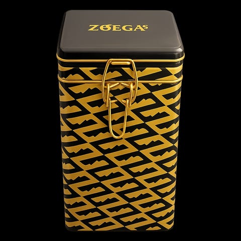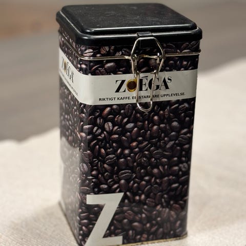Plåtburk som ser typ likadan ut som en sån däring zoega kaffeburk. Flyger med lite Kardemummakärnor o annat gött.