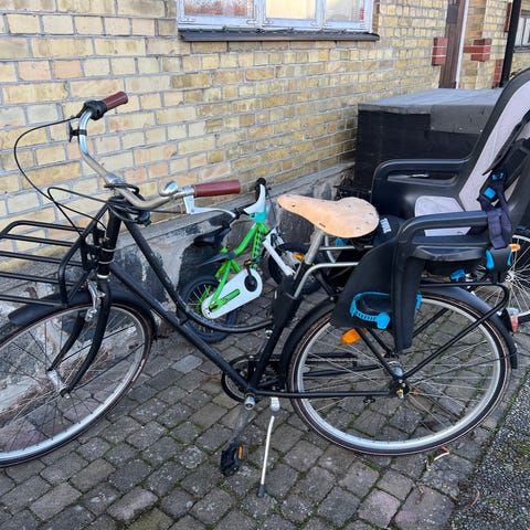 Bilderna visar cykeln både med och utan korg på pakethållaren.