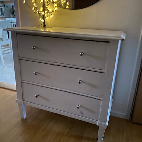 Hemnes byrå i vitt. Färgen har ev skiftats en aning på sina ställen men annars är den i mycket bra skick. Priset kan diskuteras vid smidig affär.