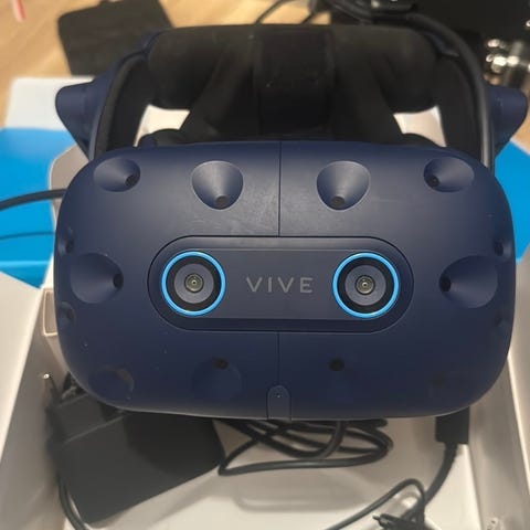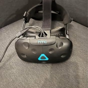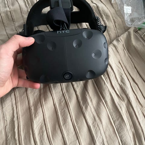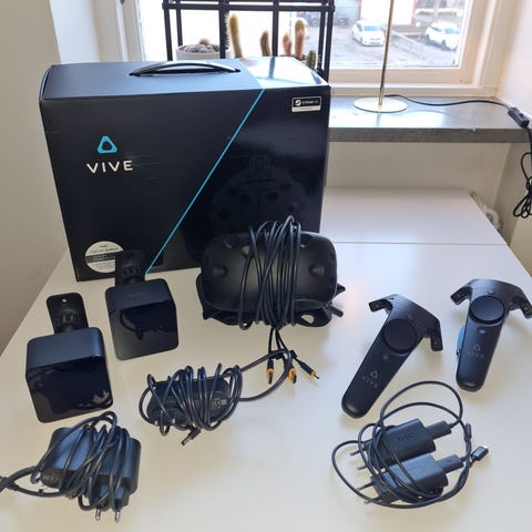 HTC Vive VR-headset i svart färg. Paketet innehåller VR-headset, handkontroller, två basstationer samt kablar och strömadaptrar som syns på bilderna. . Testad och den fungerar som den ska utan problem.