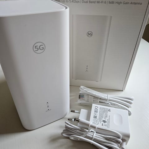 Router för mobilt bredband med stöd för 5G och Wi‑Fi 6. Enligt specifikationen på kartongen klarar routern upp till 3600 Mbps nedladdning och 500 Mbps uppladdning via 5G (teoretiska värden). Wi‑Fi 6 ger upp till 3000 Mbps med dual band och automatisk bandval. Enheten har inbyggda 5G NR high gain‑antenner.