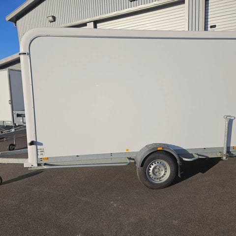 Ett Svensktillverkat, bromsat, varmgalvat, skåpsläp från Brenderup med ramp.