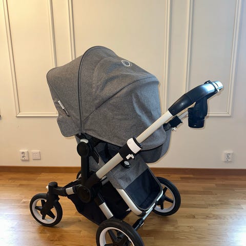 Bugaboo fox 2 barnvagn i grått tyg. Vagnen har liggdel med matchande fotöverdrag och sufflett samt separat sittdel med sele. Chassit har fyra hjul och varukorg undertill. Passar för transport av spädbarn och mindre barn i vardagen och på promenader.