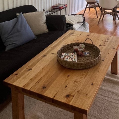 Synligt använd, små skador på själva skivan, annars i gott skick. Orkar du slipa och lacka blir det fint igen.
