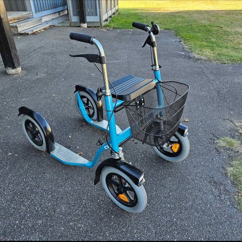 Me-mover är ett kul sätt att ta sig fram och träna eller rehaba efter skada. Den fungerar som en trappmaskin på hjul och blir stadig tack vare de tre hjulen. Ingen elmotor.