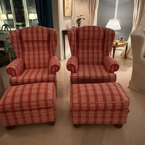 Fina fåtöljer, höga i ryggen så dom är supersköna och med fina fotpallar. Säljer båda med fotpallar för endast 2000 kr