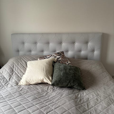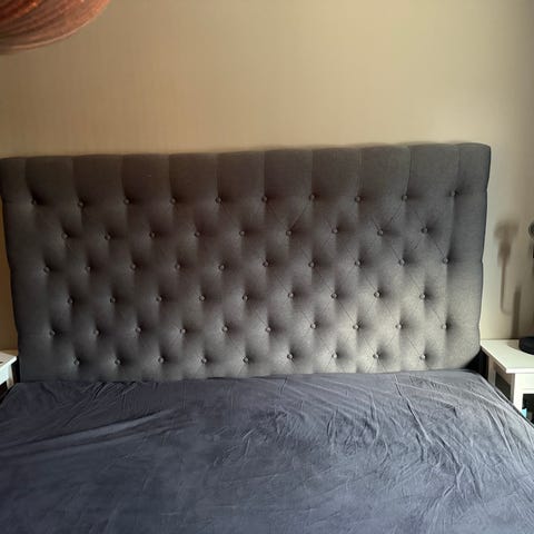 Grå, stoppad sänggavel säljes. B180 cm x D10-11 cm x H124-142 cm. Höjden kan justeras tack vare bultar genom benen (se bild).