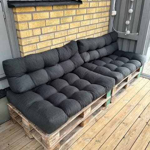 Säljer stor utesoffa gjord av sj pallar komplett med dynor till hela soffan , fick inte med alla på bild i bra skick