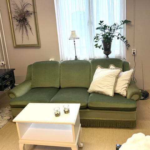 Hej! Säljer ni våran fina soffa, i en grön fin färg. Säljs pågrund av flytt och att den då mera kommer vara för stor.