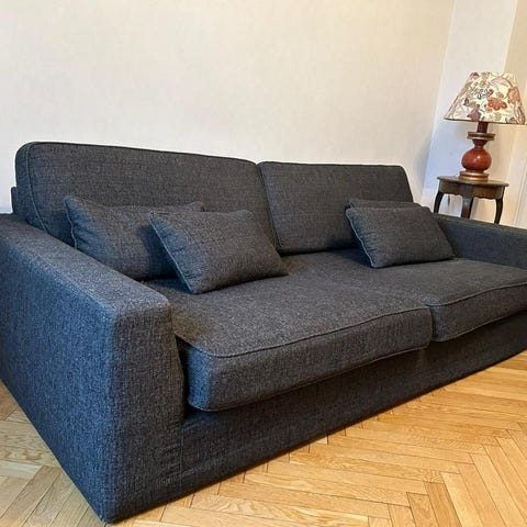 Två st helstoppade tvåsitssoffor av modellen Cassina Maralunga (italiensk designer), antracit färgad textilklädsel, löstagbara dynor och vikbar rygg. Bredd 165 cm, höjd 68 cm/sitthöjd 41 cm och djup 80 cm.