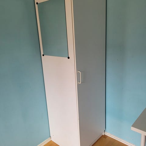 Skohylla med spegel som skruvas fast i vägg, spegel kan öppnas med skoförvaringen i hyllplan inbyggd bakom spegeln. Det finns 2 mindre skador finns som syns i bilderna. Skåpet finns i Hammarby Sjöstad och kan hämtas på plats.