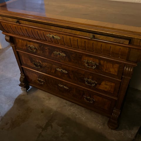 Lite skavd på sidorna. Beslag saknas delvis på en av lådorna. Annars OK.