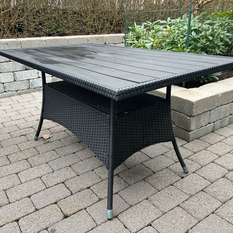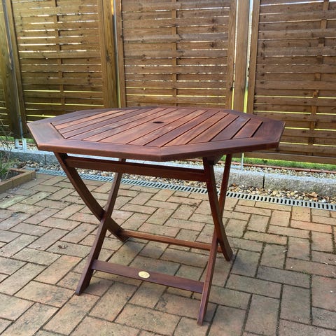Beg hopfällbart trädgårdsbord vintage i trä.
