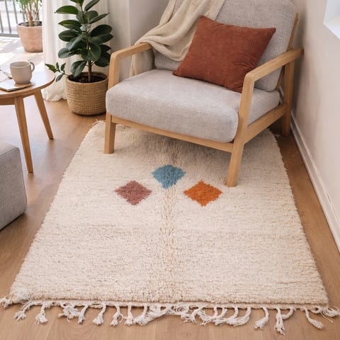Skapa en varm och stilren känsla i ditt hem med en handknuten Beni Ourain-matta, tillverkad av naturlig, obehandlad ull av berberkvinnor i Atlasbergen.