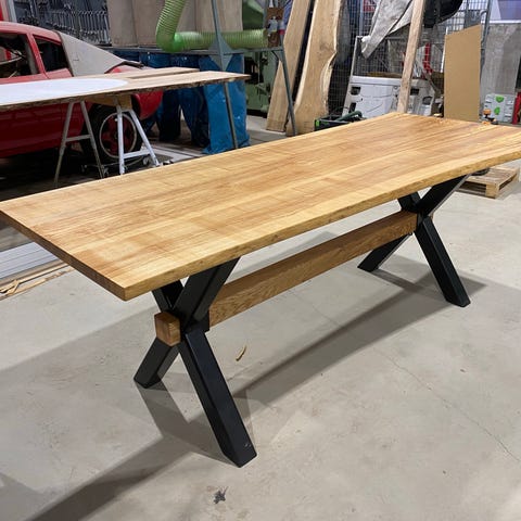 Matbordet är köpt på Ilva och måtten är 2 meter i längd, bredd på 94 cm, höjd på 75 cm, och 4 cm tjock bordsskiva. Detta mycket välvårdade ek-matbord har en slät bordsskiva och raka kanter. Regelbundet inoljat, dvs har en fin lyster utan vare sig repor eller fläckar. Ett fantastiskt fint bord som speglar samspelet mellan stål och trä. Snygg benställning i robust metall/stål, svart i färgen.