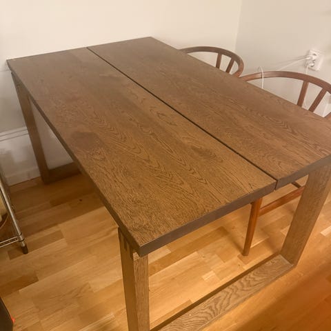 Nätt klaffbord i massiv ljus ek. Bra storlek för två och lätt att fälla upp klaffen för fyra personer. Hämtas på södermalm.