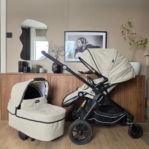 Alla tre delar klickas enkelt på samma chassi. Det gör vardagen betydligt smidigare – till exempel när din baby har somnat i bilen. Då kan du bara lyfta ur babyskyddet och klicka fast det direkt på chassit när du ska in i en butik eller ta en promenad, utan att väcka barnet.