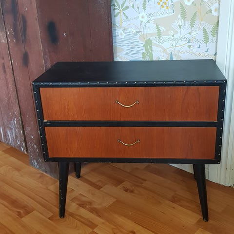Byrån är nyligen lätt handslipad och inoljad vilket har fräschat upp ytan och gett träet ny lyster. Tre rymliga lådor med infällda handtag och bra förvaring. Lådorna löper fint och möbeln står stabilt.