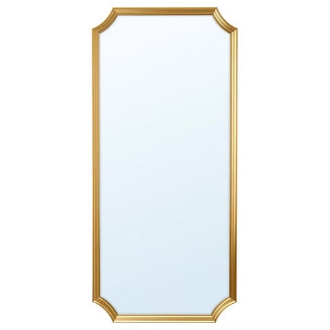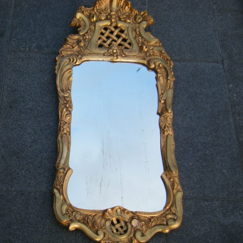 197×84 cm på bredaste ställena. Spegeln är sannolikt från slutet på 1800 talet att döma av de tidningsurklipp från en Malmötidning som är klistrade på baksidan. Spegeln är en bröllopsgåva från släktingar i Köpenhamn till mina föräldrar som gifte sig 1948. Spegelglaset som är fasettslipat är fint och rent. Avskavd på sina ställen och lite andra skavanker men på det hela taget fin.