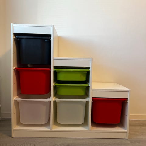 Söta stapelbara, vikbara, förvaringslådor för Lego Duplo eller annat. 25 liter. Vita med gula lock som man kan bygga Duplo på.