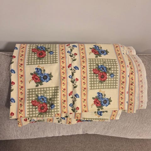 Kraftigt bomullstyg lite stretchigt passar som möbeltyg eller kavaj, jag har själv sytt en lång kavaj av detta och tyget faller snyggt. Bredd ca 147 cm, längd 420 cm.