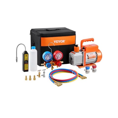 Vakuumpump med elanslutning, bärhandtag och ansluten gummislang med ventil. Pumpen är avsedd för att skapa undertryck i slutna system, till exempel vid service av kyl- och luftkonditioneringsanläggningar eller andra tekniska applikationer där vakuum behövs. Utrustad med påfyllningslock för olja och varningsmärkning på ovansidan. Levereras med nätkabel och monterad slang med koppling.