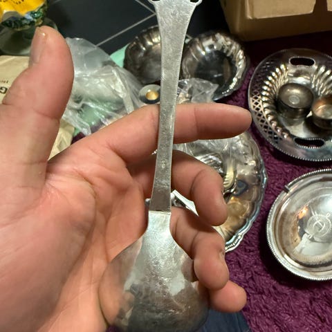 Sked i silver med stämplar 825 enligt bild. Skeden har en dekorativt utformad skålformad skeddel med snäckliknande relief och förgylld insida samt ett rikt dekorerat skaft. Lämplig som serveringssked, exempelvis för sås eller dessert. Vikt enligt bild cirka 50 g. Exakt silverhalt och tillverkare framgår av stämplarna på skaftet. 825