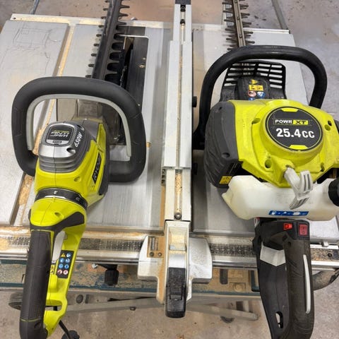 Hitachi CG 27EJ(SLNP) med en rad tillbehör för trädgårdsarbete. Inkluderar en häcksax och en motorsåg. Perfekt för olika uppgifter i trädgården.