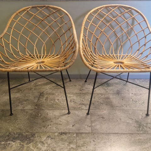 Jag säljer två FRYKSÅS-fåtöljer i handvävd rotting med två sittdynor och ett bord. Allt är köpt för 6 585 kr, kvitto finns, och det är knappt använt.