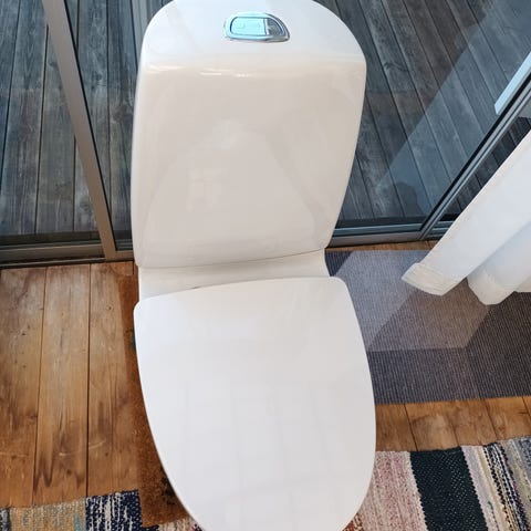 Helt ny IFÖ wc stol utan spolkanter för lättare rengöring, i spolknappen kan man stopp en frech sticka då får man blått spolvatten som är även bakteriedödande.