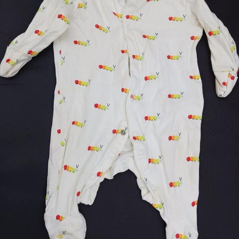Randig body med en röd hjärtapplikation på bröstet och knappar framtill. Fint skick då den knappt hunnit bli använd.