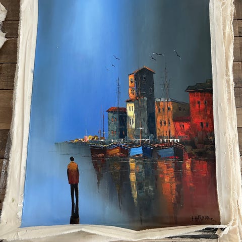 Tavla med motiv av stadslandskap i blå och orange ton med en ryttare i förgrunden. Målningen visar höga byggnader och deras spegling i vatten.