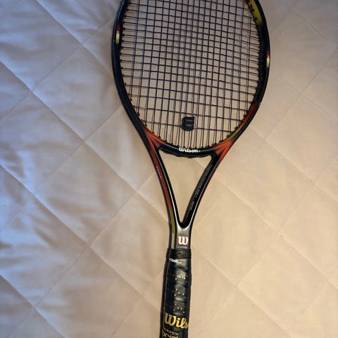 Wilson tennisracket i röd färg med vit och blå detaljering. Greppstorlek 3½" enligt märkning på skaftet. Racketen har strängar monterade och vitt grepp. Passar för tennis och kan användas både för träning och spel beroende på spelarens nivå och behov.