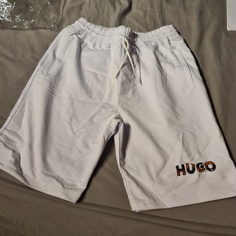 Hugo Boss shorts för herr i storlek XXL. Byxorna är vita och tillverkade i bomull. De har resår och dragsko i midjan samt tryckt Hugo-logotyp. Passar som bekväma vardags- eller träningsbyxor.