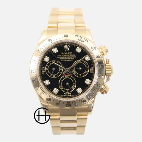 Säljer en mycket fin Rolex Daytona ref. 16518 i 18k gult guld från slutet av 90-talet. Detta är en eftertraktad modell med den ovanliga “inverted 6” tavlan där siffran 6 på subdialen är upp-och-ner.