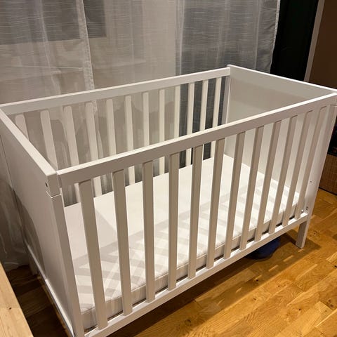 Aldrig använd (då vårat barn inte velat sova i spjälsäng) men har varit monterad i ca vecka.