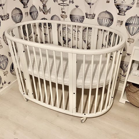 Stokke Sleepi spjälsäng i vit färg. På bild är det den större varianten upp till 120 cm men säljer även i detta paket delarna till mini varianten (platta och madrass).