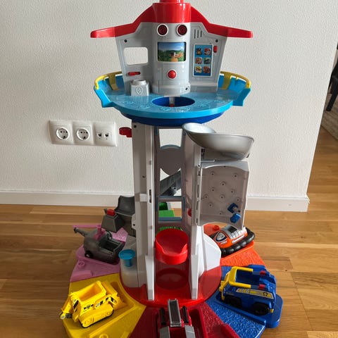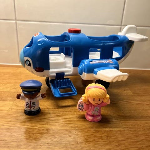 Little People Spinnin Sounds Airport från Fisher Price, komplett med 1 Eddie figur, 1 pilot, 1 flygplan, 1 bagagevagn, 2 resväskor, 2 café-stolar, 1 bord med parasoll.