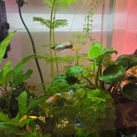 Behöver bli av med dessa guppyhonor och ett större antal yngel. Svårt att uppskatta hur många det är, 20-50st kanske. De vill inte stå på rad och bli räknade. Vissa är tyvärr lite missbildade pga inavel då jag inte har intresse av avel. Sonen vill ha guppy, så nu får han behålla hanarna bara.